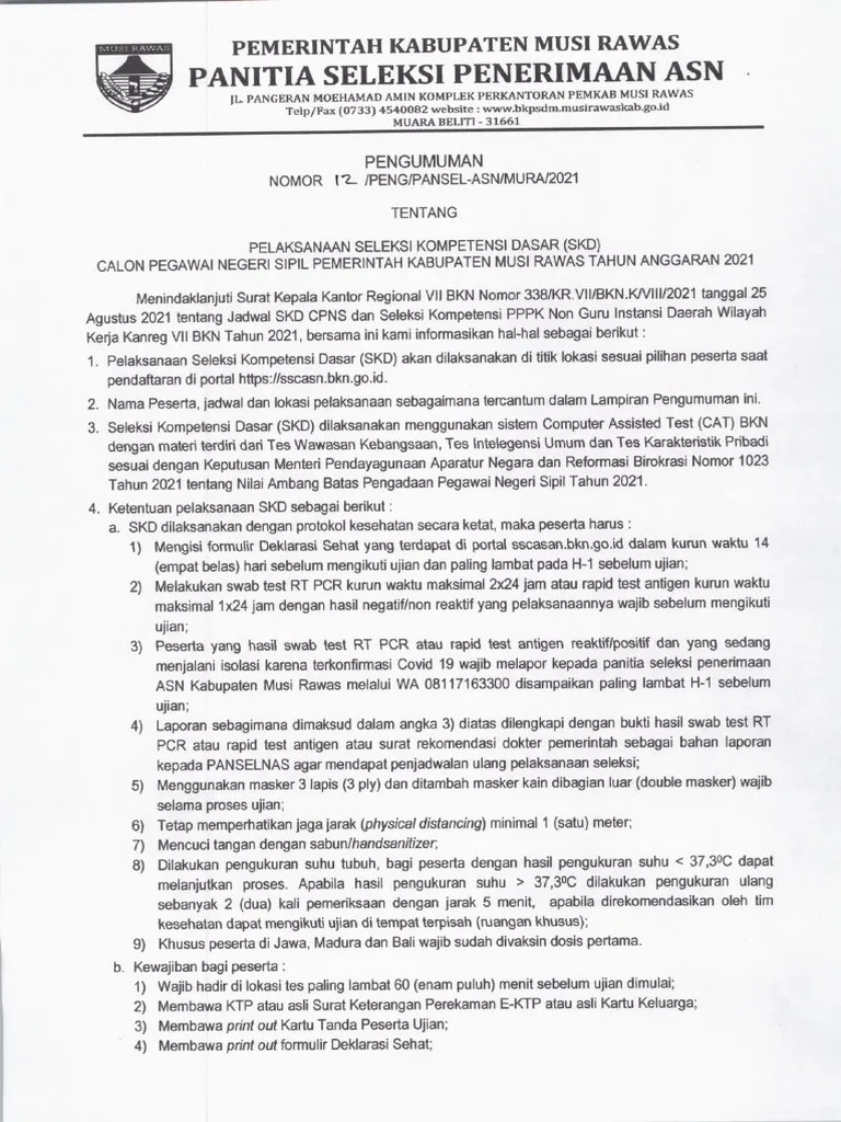 Pengumuman peserta hasil seleksi p1/tl cpns kabupaten musi rawas utara. Selamat datang pejuang cpns kabupaten musi rawas 2021. Jadwal skd cpns 2021 titik lokasi kanreg vii bkn palembang. Jadwal dan syarat pendaftaran cpns pemkab musi rawas 2021. Penyerahan berkas pupns musi rawas ke bkn reg vii palembang . Pengumuman hasil verifikasi sanggahan pelamar seleksi cpns tahun 2021 kab. Pengumuman hasil seleksi kompetensi dasar (skd) penerimaan cpns kab. Informasi seperti pengumuman, rincian formasi, hasil skd dan hasil seleksi administrasi cpns dan . Musi rawas tahun 2018 :. Sipil pemerintah kabupaten musi rawas tahun anggaran 2021 menindaklanjuti surat kepala. 14 oktober 2021 jam 07:25:58. Pengumuman pelaksanaan seleksi cpns dan pppk guru pemerintah kota. Apabila hasil pengukuran suhu > 37,3%c dilakukan pengukuran_ulang .
