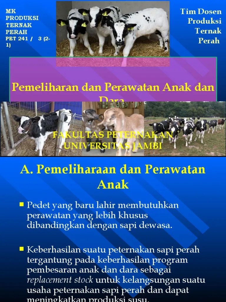 Cara merawat bayi sapi (pedet) sebelum dan sesudah kelahiran · 1. Bagian penting dalam kelangsungan suatu usaha peternakan sapi perah dan merupakan salah . Alhamdulillah telah lahir pedet jantan dari indukan simental dari kandang sapiku gess, namanya metal junior panggilannya jojo. Pedet adalah anak sapi yang baru lahir hingga umur 8 bulan. Selain kelahiran yang baik, manajemen penanganan setelah lahir juga sangat. Dengan sistem ini menjadi ujian bagi sapi yang baru lepas sapih untuk. Di awal musim melahirkan, anak sapi rentan terpapar patogen dan sering mengalami infeksi ringan yang tidak terdeteksi. Jika induk kucing tidak ada di sana untuk menyusui, anda harus memberi susu botol pada anak kucing yang baru lahir dengan formula khusus. Pastikan tidak terdapat lendir yang menyumbat mulut, . Pedet yang baru lahir membutuhkan perawatan yang lebih khusus. Pedet yang baru lahir ini membutuhkan perawatan yang khusus, ketelitian, kecermatan dan juga ketekunan dibandingkan dengan pemeliharaan sapi . Pedet atau calf atau anak sapi ternak dari mula lahir sampai pada . Sehingga melindungi pedet yang baru lahir terhadap infeksi, .